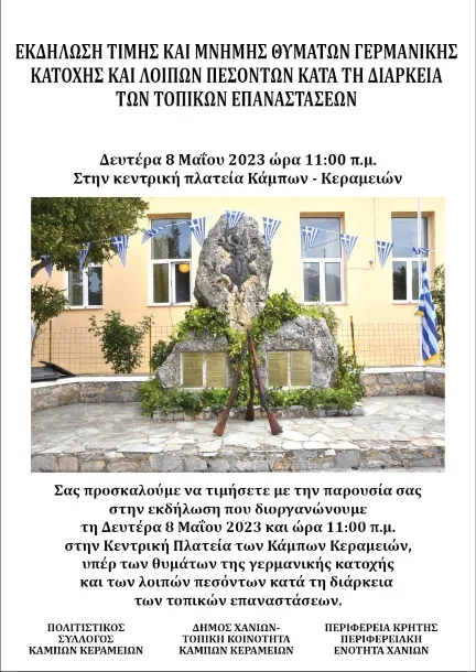 Εκδήλωση τιμής και μνήμης υπέρ των θυμάτων της 8ης Μαΐου 1944 και των λοιπών πεσόντων κατά τη διάρκεια των τοπικών επαναστάσεων πραγματοποιείται τη Δευτέρα 8 Μαΐου 2023 και ώρα 11:00 στην Κεντρική Πλατεία Κάμπων...