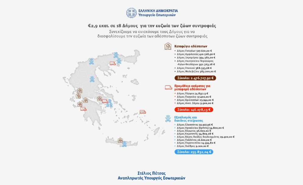 2,9 εκατ. ευρώ σε 18 Δήμους, για την ευζωία των ζώων συντροφιάς