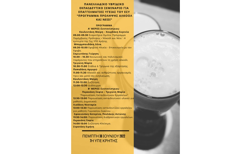Στο πλαίσιο της επιμόρφωσης των επαγγελματιών μονάδων υγείας του ΕΣΥ σε συγκεκριμένες δράσεις/παρεμβάσεις στον μαθητικό πληθυσμό και την κοινότητα, η 7η ΥΠΕ Κρήτης διοργανώνει το πρώτο Πανελλήνιο εκπαιδευτικό σεμινάριο, με θέμα «ΠΡΟΓΡΑΜΜΑ ΠΡΟΛΗΨΗΣ “ΑΛΚΟΟΛ...