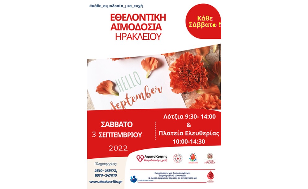 Διπλή εθελοντική αιμοδοσία θα πραγματοποιηθεί το Σάββατο 03/09/2022 στο κέντρο της πόλης του Ηρακλείου και συγκεκριμένα στο αίθριο της Λότζια απο τις 9:30 έως τις 14:00 και στην πλατεία Ελευθερίας από τις 10:00 έως τις 14:30....