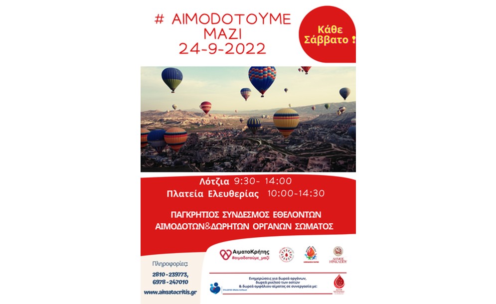 Διπλή εθελοντική αιμοδοσία θα πραγματοποιηθεί το Σάββατο 22/10/2022 στο κέντρο της πόλης του Ηρακλείου και συγκεκριμένα στο αίθριο της Λότζια απο τις 9:30 έως τις 14:00 και στην πλατεία Ελευθερίας από τις 10:00 έως τις 14:30....