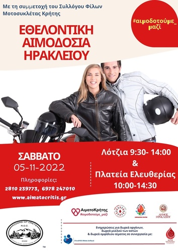 Διπλή εθελοντική αιμοδοσία θα πραγματοποιηθεί το Σάββατο 05/11/2022 στο κέντρο της πόλης του Ηρακλείου και συγκεκριμένα στο αίθριο της Λότζια απο τις 9:30 έως τις 14:00 και στην πλατεία Ελευθερίας από τις 10:00 έως τις 14:30....