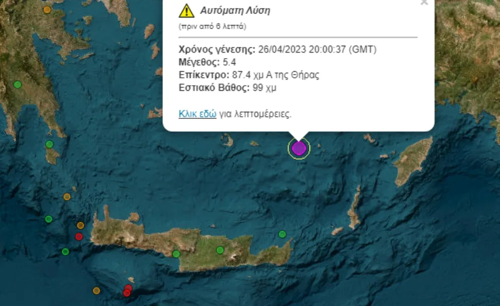Σεισμός εντάσεως 5,4 βαθμών της κλίμακας Ρίχτερ σημειώθηκε το βράδυ της Τετάρτης, στις 23:00, με επίκεντρο στη θαλάσσια περιοχή 88 χιλιόμετρα ανατολικά της Θήρας Σαντορίνης. Ο σεισμός σύμφωνα με το ΕΚΠΑ είχε εστιακό βάθος...