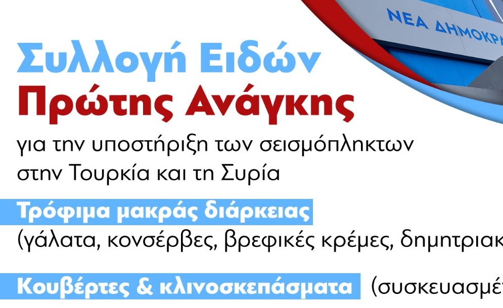 ΝΔ: Συλλογή Ειδών Πρώτης Ανάγκης για τους σεισμόπληκτους της Τουρκίας και της Συρίας