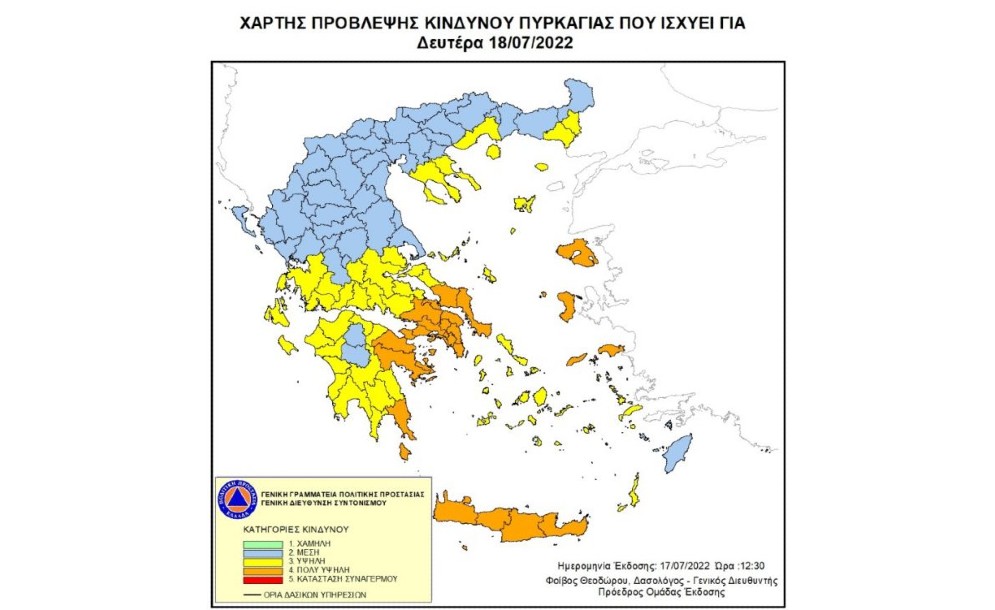 Σύμφωνα με το Χάρτη Πρόβλεψης Κινδύνου Πυρκαγιάς που εκδίδει η Γενική Γραμματεία Πολιτικής Προστασίας του Υπουργείου Κλιματικής Κρίσης & Πολιτικής Προστασίας (www.civilprotection.gr), τη Δευτέρα 18 Ιουλίου 2022, προβλέπεται πολύ υψηλός κίνδυνος πυρκαγιάς (κατηγορία κινδύνου 4) για τις εξής περιοχές: Περιφέρεια Αττικής (συμπεριλαμβανομένης της...