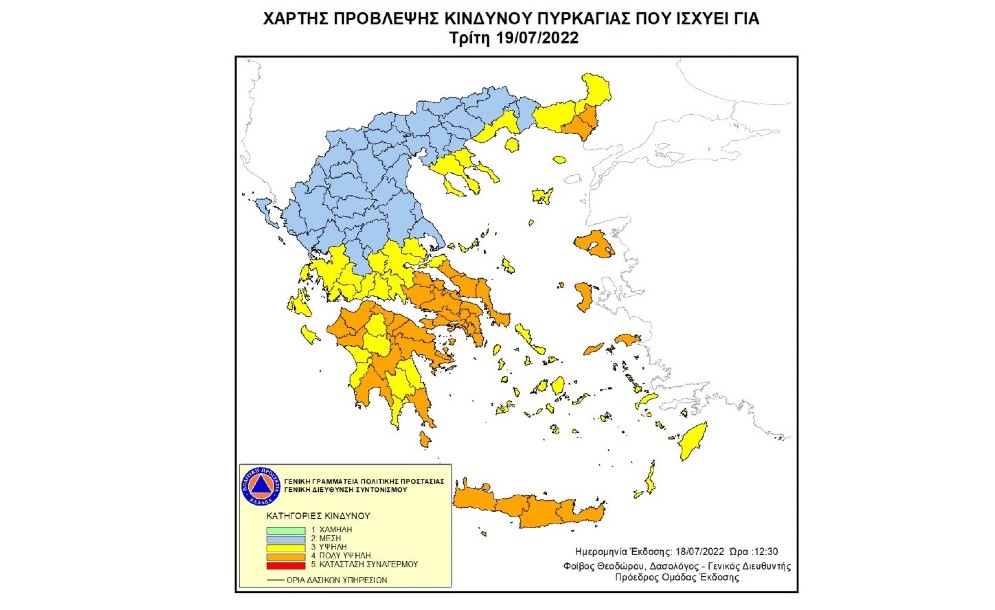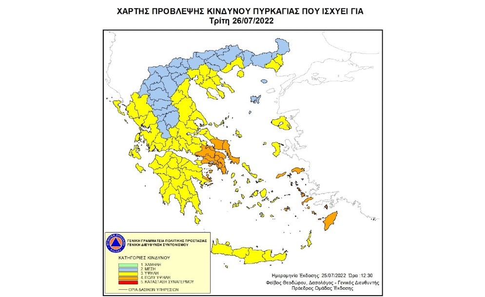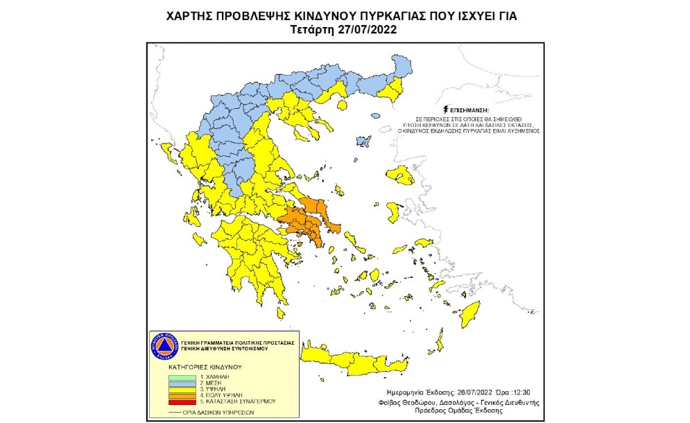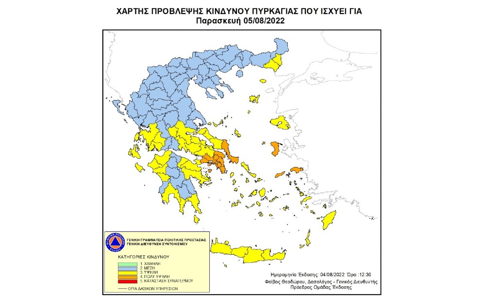 Σύμφωνα με το Χάρτη Πρόβλεψης Κινδύνου Πυρκαγιάς που εκδίδει η Γενική Γραμματεία Πολιτικής Προστασίας του Υπουργείου Κλιματικής Κρίσης & Πολιτικής Προστασίας (www.civilprotection.gr), για αύριο Παρασκευή 05 Αυγούστου 2022, προβλέπεται πολύ υψηλός κίνδυνος πυρκαγιάς (κατηγορία κινδύνου 4) για τις εξής περιοχές: Περιφέρεια Βορείου Αιγαίου...