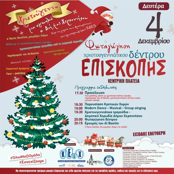 Στο πλαίσιο των εκδηλώσεων 2023 «Χριστούγεννα, μια αγκαλιά ο Δήμος Χερσονήσου» η Κοινωφελής Επιχείρηση Δήμου Χερσονήσου (Κ.Ε.Δ.Χ.) συνδιοργανώνει με τον Πολιτιστικό και Λαογραφικό Σύλλογο Επισκοπής Πεδιάδος και με την υποστήριξη του Δήμου Χερσονήσου, την...