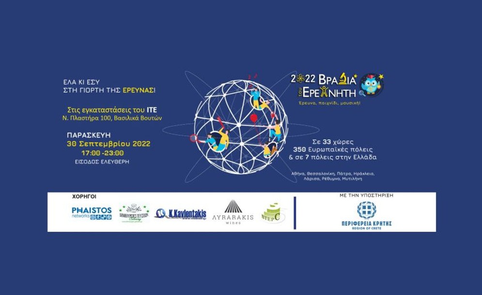 Το Ίδρυμα Τεχνολογίας και Έρευνας, με ιδιαίτερη χαρά, προσκαλεί το ευρύ κοινό και τους μικρούς μας φίλους στη Βραδιά Ερευνητή 2022, η οποία θα πραγματοποιηθεί στις εγκαταστάσεις του Ιδρύματος στα Βασιλικά Βουτών την Παρασκευή, 30 Σεπτεμβρίου...