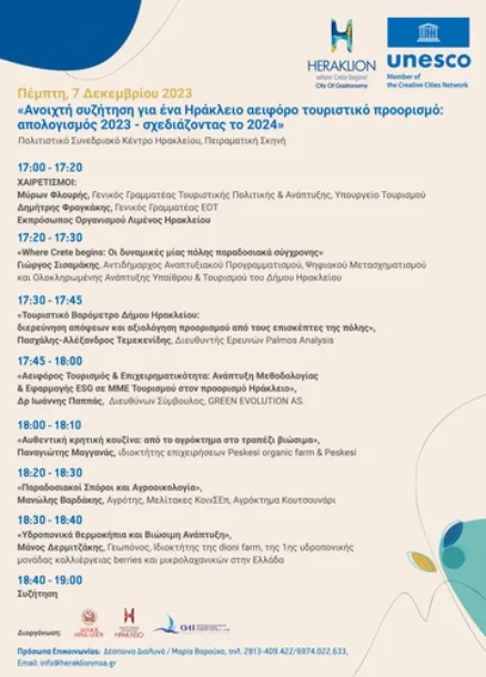 Νωρίτερα, στις 17.00 – 19.00, στην ίδια αίθουσα, ο Δήμος Ηρακλείου με τον Αναπτυξιακό Οργανισμό “Ηράκλειο Μ.Α.Ε.” και τον Οργανισμό Λιμένος Ηρακλείου διοργανώνουν εσπερίδα με θέμα «Ανοιχτή συζήτηση για ένα Ηράκλειο αειφόρο τουριστικό προορισμό: απολογισμός 2023 – σχεδιάζοντας το 2024». Θα χαιρετίσουν οι Μύρων Φλουρής, Γενικός Γραμματέας Τουριστικής Πολιτικής & Ανάπτυξης Υπουργείου Τουρισμού και Δημήτρης Φραγκάκης, Γενικός Γραμματέας ΕΟΤ. Θα ακολουθήσουν ομιλίες σχετικά με τον Τουρισμό και την Αειφόρο Ανάπτυξη με έμφαση στους δείκτες αειφορίας στην επιχειρηματικότητα και το προφίλ των επισκεπτών της πόλης ενώ η εσπερίδα θα ολοκληρωθεί με καλές πρακτικές από τον κλάδο της Γαστρονομίας και της Αγροοικολογίας