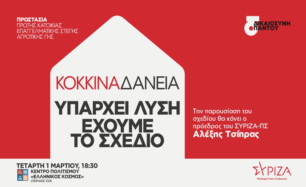 Ο πρόεδρος του ΣΥΡΙΖΑ ΠΣ, Αλέξης Τσίπρας, θα παρουσιάσει τη Τετάρτη 1 Μαρτίου, το πρόγραμμα του ΣΥΡΙΖΑ ΠΣ για την προστασία της πρώτης κατοικίας, τα κόκκινα δάνεια και το ιδιωτικό χρέος.