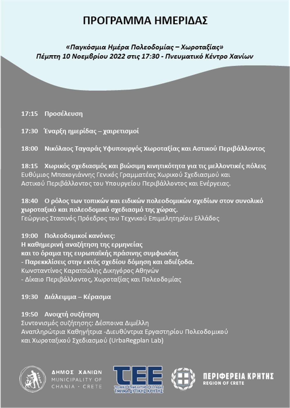 Ο Δήμος Χανίων και το Τεχνικό Επιμελητήριο Ελλάδος (Τ.Ε.Ε.) – τμήμα Δυτικής Κρήτης, σε συνδιοργάνωση με την Περιφέρεια Κρήτης-Περιφερειακή Ενότητα Χανίων, στο πλαίσιο της Παγκόσμιας Ημέρας Χωροταξίας και Πολεοδομίας που έχει καθιερωθεί την 8η Νοεμβρίου, διοργανώνει ημερίδα την Πέμπτη 10 Νοεμβρίου 2022 στις 17:30 στο Πνευματικό Κέντρο Χανίων.