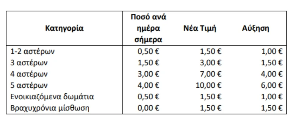 Η παλιά κλίμακα του φόρου διαμονής και το νέο τέλος αντιμετώπισης των συνεπειών της κλιματικής αλλαγής ανάλογα με την κατηγορία του καταλύματος έχουν ως εξής: